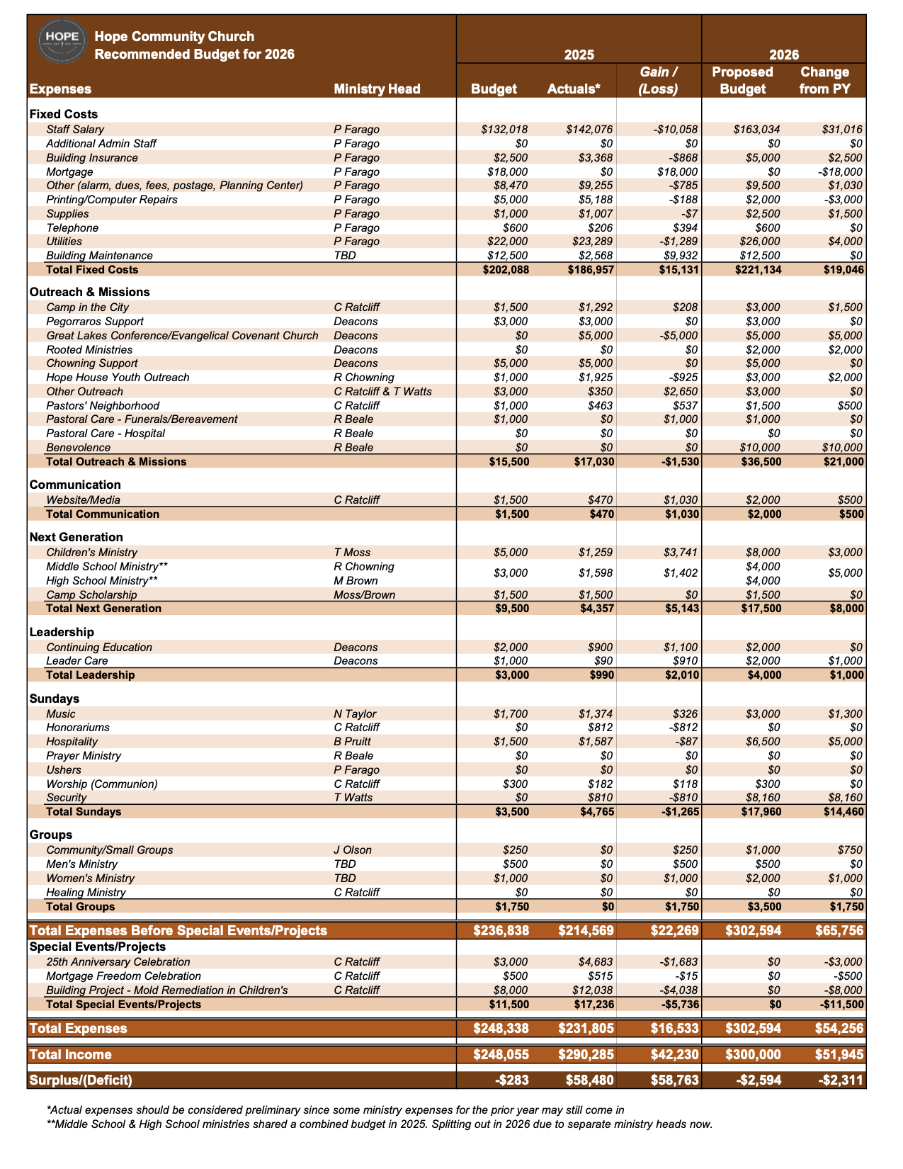 The Financial Committee and the Deacon Board have approved the proposed 2026 budget. Hard copies were handed out on Sunday, Jan. 11. This provides two weeks to review prior to the Annual Church Meeting on Jan. 25 where the budget will discussed and voted upon. Please take some time to review the budget details prior to the meeting.